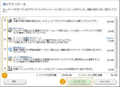 標準的なソフトウェアと電子マニュアルをインストールする[おまかせインストール]と任意のソフトウェアやマニュアルを指定してインストールする[選んでインストール]の2種類のインストール方法があります。