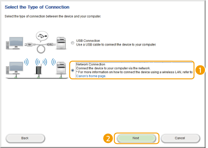 If you are connecting the machine and a computer via a USB cable, install the software before connecting the USB cable. A USB cable is not included with the machine. Prepare one separately. |