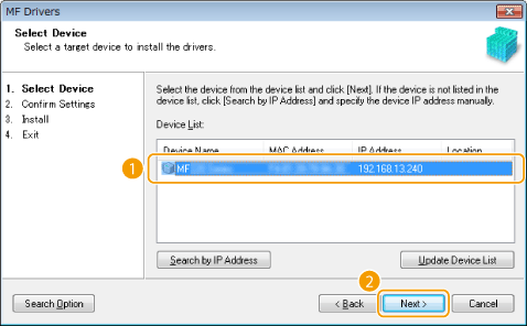 Viewing Network Settings (e-Manual)), and click [Update Device List]. If the machine is still not displayed at all, click [Search by IP Address]