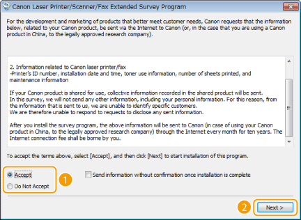 | If you select [Accept], the Product Extended Survey Program is installed. The Product Extended Survey Program is a program to send basic information related to installation and usage of the printer to Canon every month for 10 years. It does not send any other information, including your personal information. You can uninstall the Product Extended Survey Program at any time. Uninstalling the Product Extended Survey Program |