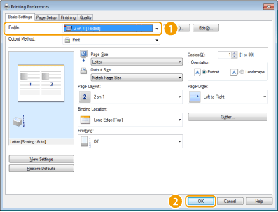 Specifying combinations of settings such as "landscape orientation on Letter size paper in save toner mode" every time you print is time consuming. If you register your frequently used combinations of print settings as "profiles," you can specify print settings simply by selecting one of the profiles from the list. This section explains how to register profiles and how to print using profiles.