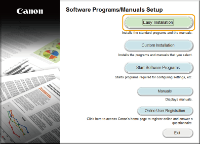 You can choose to install standard software and the e-Manual with [Easy Installation], or specify the software and manuals to install with [Custom Installation].