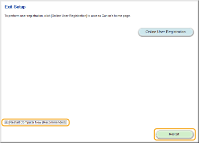 Select the [Restart Computer Now (Recommended)] check box, and click [Restart] after removing the CD-ROM/DVD-ROM.