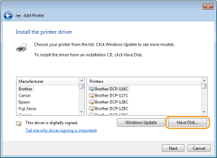 If you are using Windows Vista/7/8/Server 2008/Server 2008 R2/Server 2012/Server 2012 R2, you can print by using the WSD (Web Services on Devices) protocol. If you want to use WSD, first install the printer driver and then add a network printer.