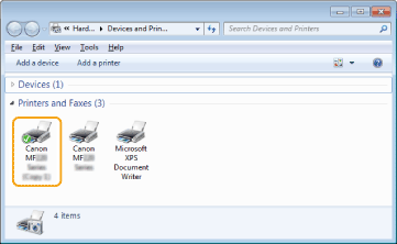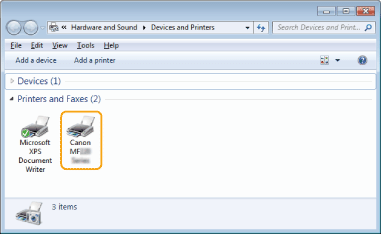 Deleting unneeded printer iconsWhen you have finished installing the network printer, the icon added in step 13 of Installing the MF Drivers is no longer needed. To delete the icon, right-click it and select [Remove device] or [Delete]  click [Yes]. |