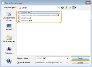 Spécifiez le dossier contenant les pilotes, sélectionnez le fichier Inf et cliquez sur [Ouvrir].