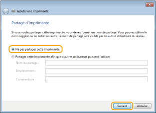 Sélectionnez [Ne pas partager cette imprimante], puis cliquez sur [Suivant].