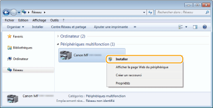 Suppression des icônes d'imprimantes inutilesLorsque l'installation de l'imprimante réseau est terminée, l'icône ajoutée à l'étape 13 de Installation des pilotes MF n'est plus nécessaire. Pour la supprimer, cliquez dessus avec le bouton droit et sélectionnez [Supprimer le périphérique] ou [Supprimer]  cliquez sur [Oui]. |