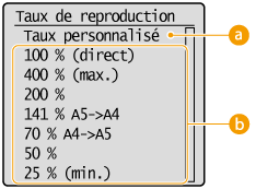 Vous agrandissez ou réduisez les copies en appliquant un taux de reproduction prédéfini, <A5->A4> par exemple, ou en définissent un taux de reproduction personnalisé par incréments de 1 %.
