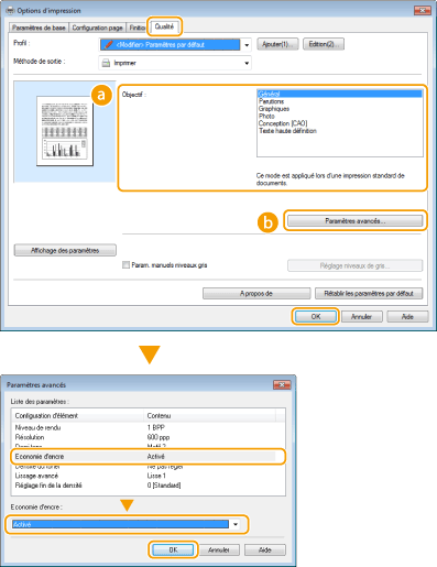 Vous pouvez définir le pilote d'imprimante afin d'imprimer les documents en utilisant moins d'encre.