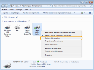 Cliquez avec le bouton droit sur l'icône de l'appareil, puis cliquez sur [Options d'impression].