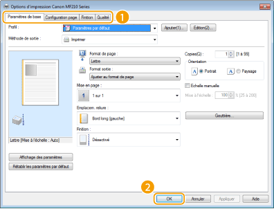 Définissez les paramètres d'impression requis dans les onglets [Paramètres de base], [Configuration page], [Finition] et [Qualité].