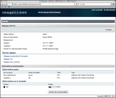 Vous pouvez afficher l'écran pour AirPrint dans lequel vous avez accès non seulement aux réglages AirPrint, mais aussi aux informations sur les consommables tels que le papier et le toner.