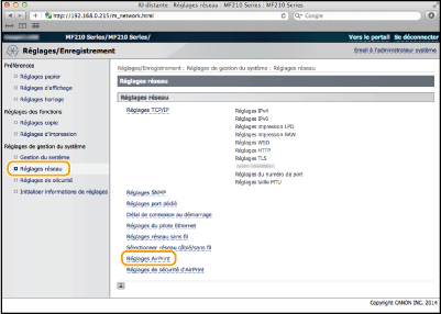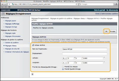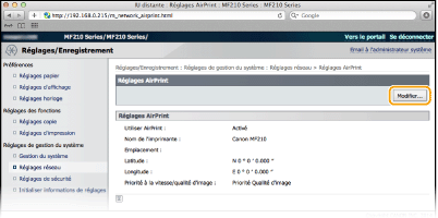 Vous pouvez enregistrer des informations, notamment le nom de l'appareil et le lieu de l'installation, destinées à identifier l'appareil. Il est également possible de désactiver la fonction AirPrint de l'appareil. Servez-vous de l'interface utilisateur distante pour les modifier.
