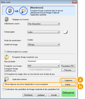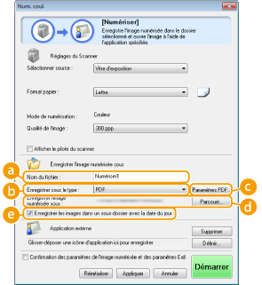 ), [Créer un fichier PDF selon] s'affiche à la place de [Enregistrer l'image numérisée sous]. Dans ce cas, spécifiez un fichier PDF auquel vous voulez ajouter les données du document qui vient d'être numérisé. Les données sont ajoutées au fichier existant sous forme de pages supplémentaires (Ajout de pages à un fichier PDF existant).