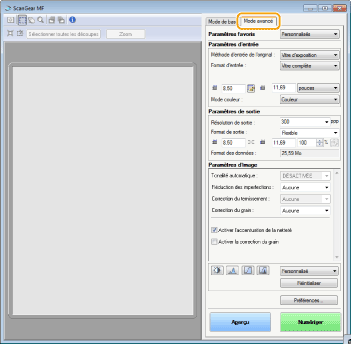Si vous cliquez sur l'onglet [Mode avancé] dans l'écran ScanGear MF, vous serez en mesure d'effectuer d'autres ajustements avancés de la qualité de l'image que ceux que vous réalisez en mode simple. Vous pouvez également enregistrer des réglages personnalisés sous forme de réglages favoris. Pour plus d'informations détaillées, cliquez sur l'icône