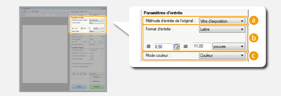 Indiquez le mode d'entrée du document, le format du document, le mode couleur et d'autres paramètres.