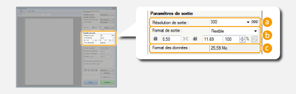 Affiche le format des données de l'image lorsque celle-ci est numérisée selon des valeurs [Résolution de sortie] et [Format de sortie] définies.