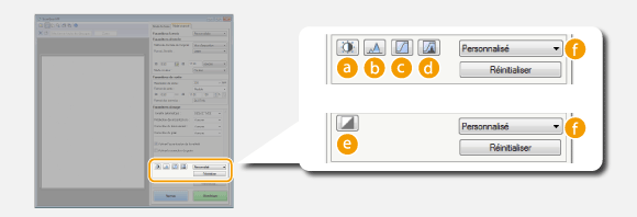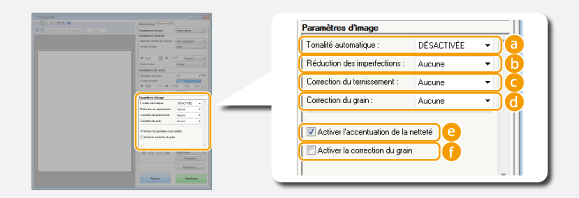 Lorsque vous numérisez les documents à l'aide d'un logiciel de reconnaissance de caractères (OCR) ou d'une autre application, il arrive parfois que l'écran ScanGear MF ne s'affiche pas. En pareil cas, le document est numérisé à l'aide des réglages de l'application. Toutefois, si l'application ne dispose pas des réglages suivants, activez-les dans cet écran de façon à appliquer les présents réglages lors de la numérisation.