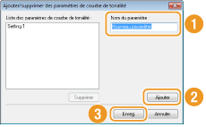 L'écran [Ajouter/supprimer des paramètres de courbe de tonalité] ou [Ajouter/supprimer des paramètres de seuil] s'affiche.