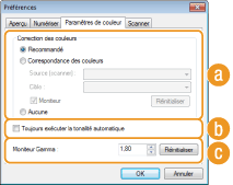 Configurez les réglages qui sont appliqués lorsque vous numérisez un document à l'aide d'une application ainsi que les réglages des opérations de l'application ScanGear MF.