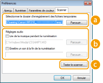 Vous pouvez définir la bande musicale ou les sons émis pendant que l'appareil procède à la numérisation ou à la fin de celle-ci. Cliquez sur [Parcourir] pour indiquer un fichier à lire. Les formats de fichier (extensions) suivants sont pris en charge :
