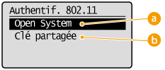 ![]() Si <Open System> est sélectionné Lorsque vous connectez un réseau local sans fil, l'appareil peut être confronté à une erreur d'authentification si l'authentification de type clé partagée est définie sur le routeur sans fil. Si cela se produit, l'appareil modifie automatiquement le réglage, sélectionne <Clé partagée> et retente la connexion. |
