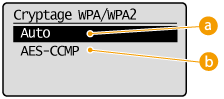 .![]() <Auto>Définit l'appareil de sorte qu'il sélectionne automatiquement AES-CCMP ou TKIP conformément au réglage du routeur sans fil.