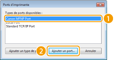 Sélectionnez [Canon MFNP Port] dans [Types de ports disponibles] et cliquez sur [Ajouter un port].