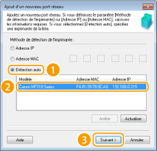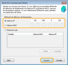 ![]() ![]() Si l'appareil n'est pas détecté Cliquez sur [Actualiser]. Si le problème persiste, cliquez sur [Adresse IP] ou [Adresse MAC], saisissez l'adresse IP ou MAC de l'appareil Affichage des réglages réseau, puis cliquez sur [Suivant].