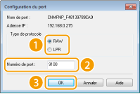 Cliquez la case d'option [LPR] ou [RAW] sous [Type de protocole], modifiez le numéro dans [Numéro de port] si nécessaire, puis cliquez sur [OK].
