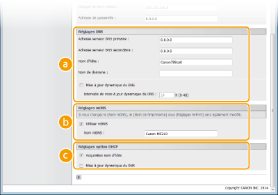 Adopté par Bonjour, le protocole mDNS (multicast DNS) est un protocole associant le nom d'hôte à une adresse IP sans faire intervenir le DNS. Cochez la case pour activer mDNS et saisissez le nom mDNS dans la zone de texte [Nom mDNS]. [Réglages option DHCP][Acquisition nom d'hôte]