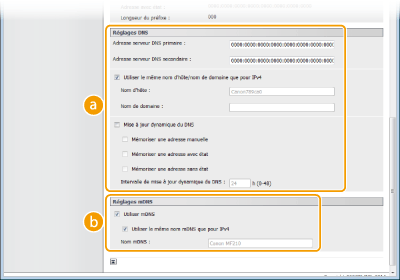 Cochez la case pour mettre à jour de façon dynamique les enregistrements DNS dès qu'une adresse IP de l'appareil change. Pour indiquer le ou les types d'adresses à enregistrer sur le serveur DNS, cochez la case [Mémoriser une adresse manuelle], [Mémoriser une adresse avec état] ou [Mémoriser une adresse sans état]. Pour indiquer le laps de temps entre deux mises à jour, saisissez-le dans la zone de texte [Intervalle de mise à jour dynamique du DNS]. [Réglages mDNS][Réglages mDNS]