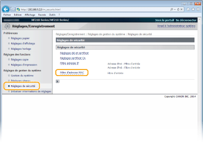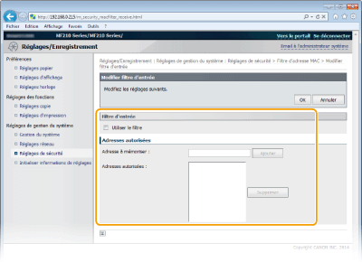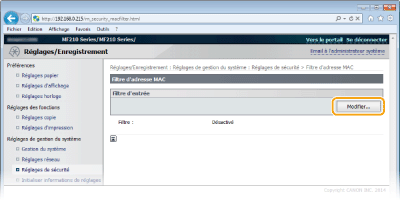 ![]() Vérification des erreurs de saisie En cas de saisie incorrecte des adresses MAC, vous risquez de ne pas pouvoir accéder à l'appareil via l'interface utilisateur distante. Si cela devait se produire, il faudrait régler <Filtre d'adresse MAC> sur <Désactivé>. Filtre d'adresse MAC