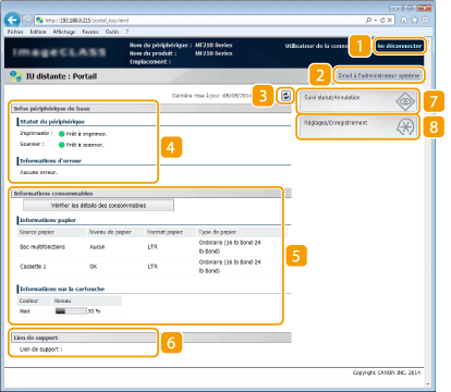 Affiche l'état actuel de l'appareil et les informations relatives aux éventuelles erreurs. En cas d'erreur, le lien vers la page d'information sur l'erreur apparaît.