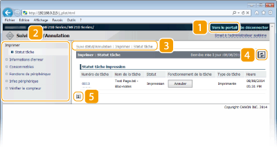 Affiche l'état des documents d'impression courants ainsi que l'historique des documents imprimés et copiés. Vous pouvez également examiner l'état de l'appareil.