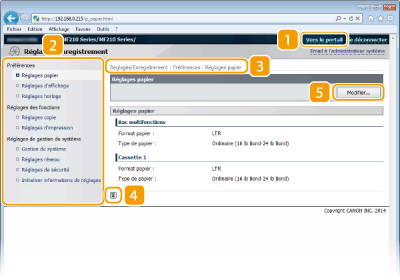 Affiche la page [Réglages/Enregistrement]. Lorsque vous êtes connecté en tant qu'administrateur système, vous pouvez modifier les valeurs des réglages et enregistrer/charger les données mémorisées.