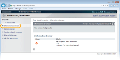 En cas d'erreur, cette page s'affiche lorsque vous cliquez sur le message figurant sous [Informations d'erreur] dans la page du portail (page principale).