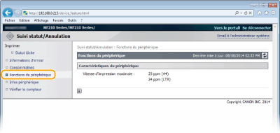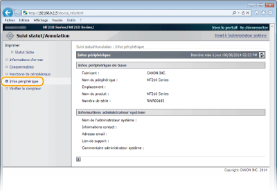 Les informations sur l'appareil et l'administrateur système s'affichent. Ces informations sont définies dans [Gestion du système] à la page [Réglages/Enregistrement].