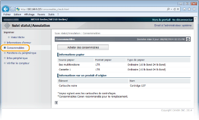 Vous pouvez également cliquer sur [Vérifier les détails des consommables] dans la page du portail (page principale) pour afficher l'écran de vérification des consommables.