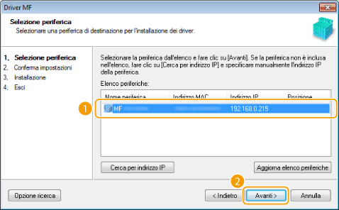 Visualizzazione delle impostazioni di rete (e-Manual)), quindi fare clic su [Aggiorna elenco periferiche]. Se la macchina continua a non essere visualizzata, fare clic su [Cerca per indirizzo IP]