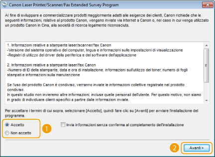 | Se si seleziona [Accetto], viene installato Product Extended Survey Program. Product Extended Survey Program è un programma utilizzato per inviare a Canon informazioni di base relative all'installazione e all'utilizzo della stampante, ogni mese per 10 anni. Esso non invia informazioni altre informazioni, comprese le informazioni personali. È possibile disinstallare Product Extended Survey Program in qualunque momento. Disinstallazione del programma di indagine estesa prodotto |