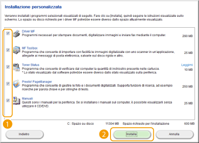 Si può scegliere di installare il software standard e l'e-Manual con l'[Installazione rapida] o di specificare il software e i manuali da installare con l'[Installazione personalizzata].