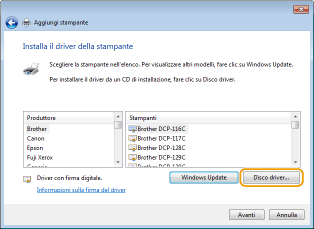 Se si utilizza Windows Vista/7/8/Server 2008/Server 2008 R2/Server 2012/Server 2012 R2, è possibile stampare utilizzando il protocollo WSD (Web Services on Devices). Se si desidera usare il WSD, installare prima il driver della stampante, quindi aggiungere una stampante di rete.