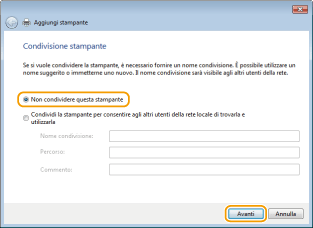 Selezionare [Non condividere questa stampante] e fare clic su [Avanti].