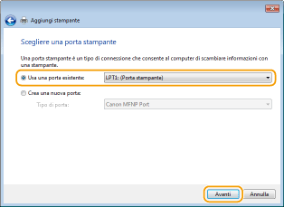 Verificare che [LPT1] sia selezionato in [Usa una porta esistente], quindi fare clic su [Avanti].