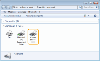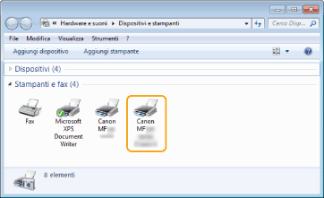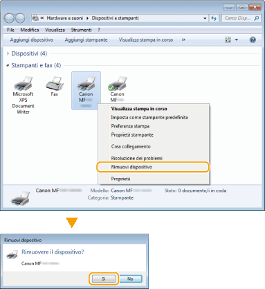 Eliminazione di icone stampante non necessarieTerminata l'installazione della stampante di rete, l'icona aggiunta nel passo 13 di Installazione dei driver MF non è più necessaria. Per eliminare l'icona, fare clic con il tasto destro del mouse sull'icona e selezionare [Rimuovi dispositivo] o [Elimina]  fare clic su [Sì]. |