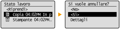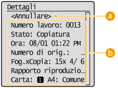 Sono visualizzati il numero di copie, le impostazioni e altri dettagli. Se si desidera solo verificare i dettagli senza annullare la copia, premere