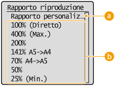 È possibile ingrandire o ridurre le copie utilizzando un rapporto di riproduzione predefinito come <A5->A4> o impostando un rapporto di riproduzione personalizzato con incrementi dell'1%.