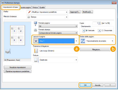 È possibile stampare più pagine su un singolo foglio. Ad esempio, è possibile stampare da quattro a nove pagine su un foglio con l'opzione [4 su 1] o [9 su 1]. Utilizzare questa funzione per risparmiare carta o visualizzare il documento come miniatura.